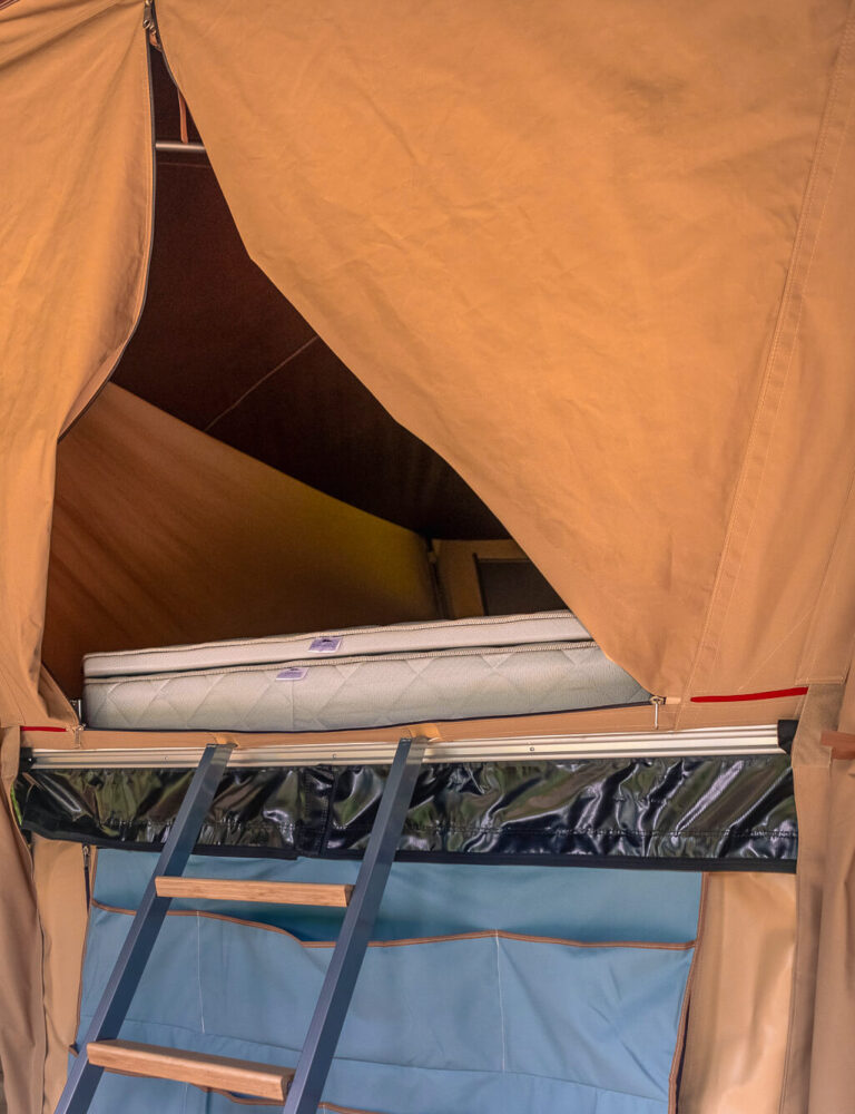 Das Zelt liegt auf dem Anhänger (statt darin) – dadurch hast du ein Mega-Bett und ganze 1.400 Liter Platz für dein Gepäck. Einfach unter dem Bett!